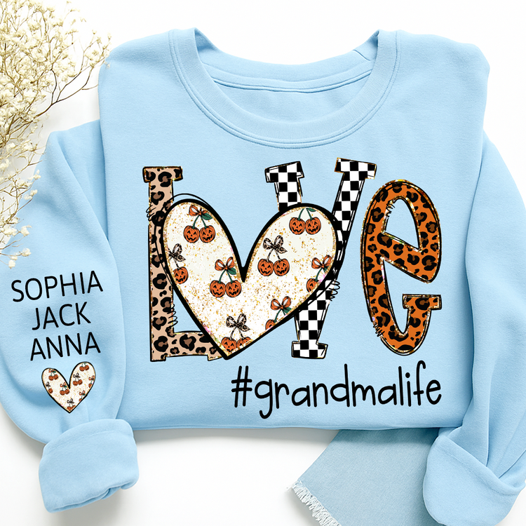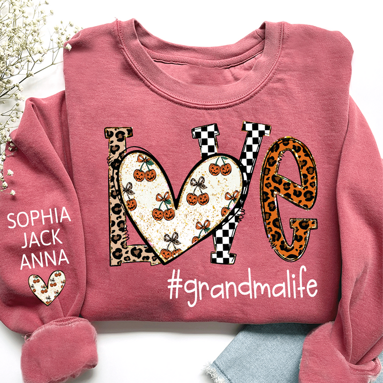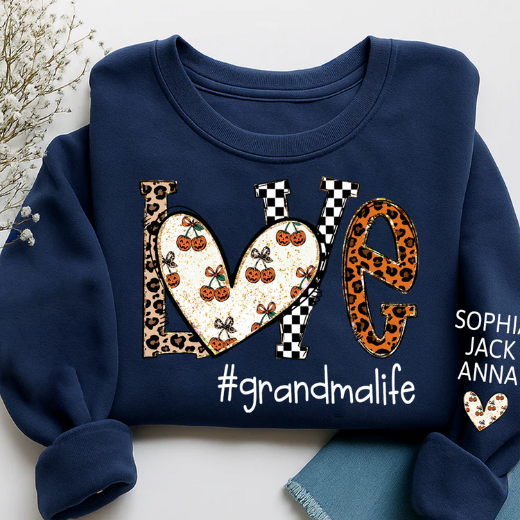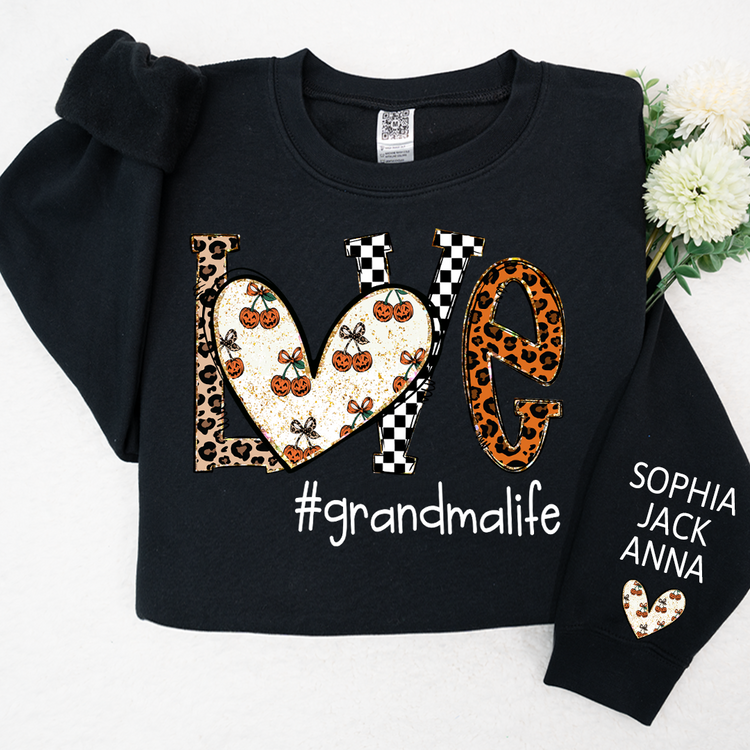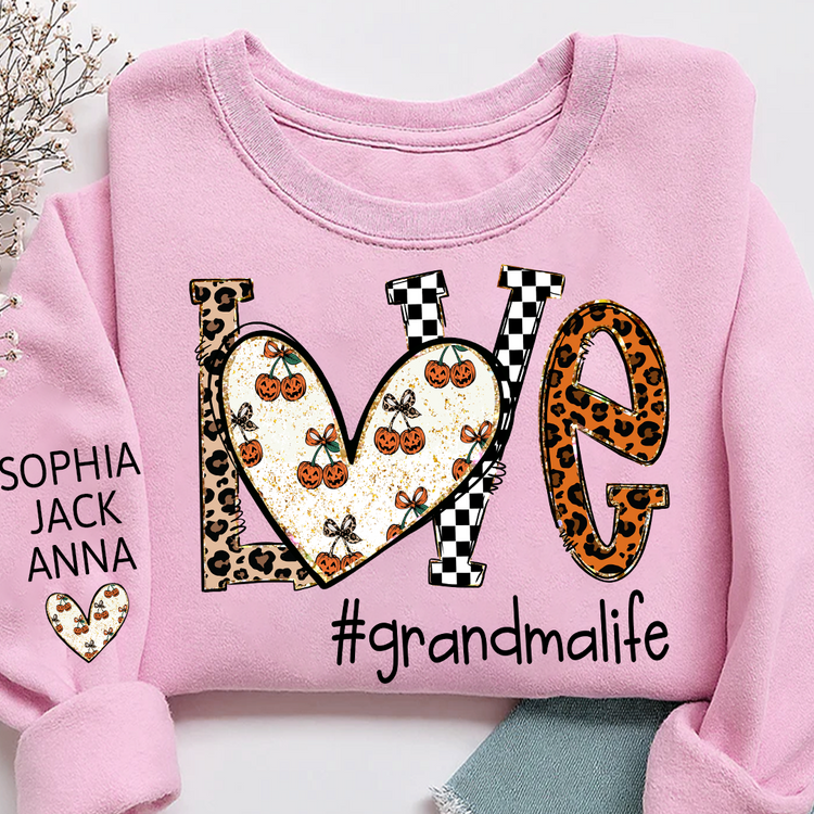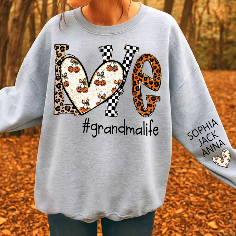 Love grandmalife Pumpkin Leopard Gift For Grandma And Grandkids Names on Sleeve Sweatshirt