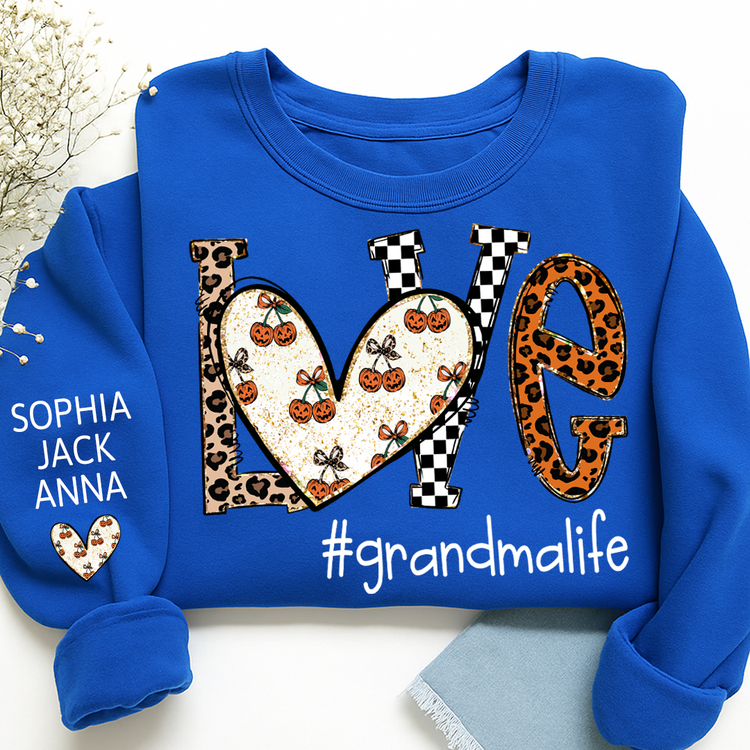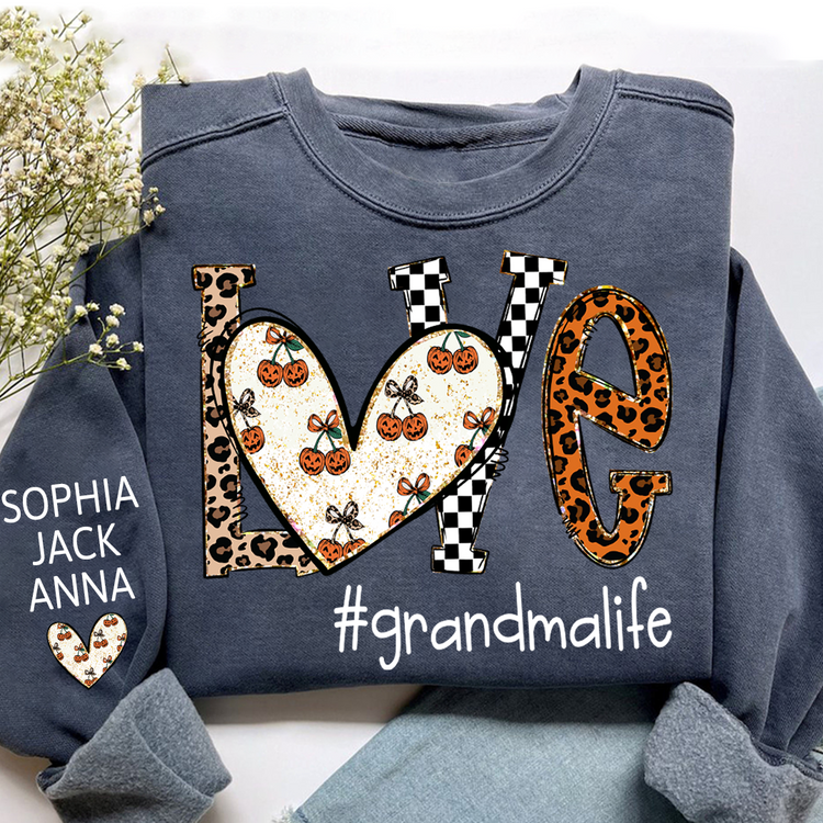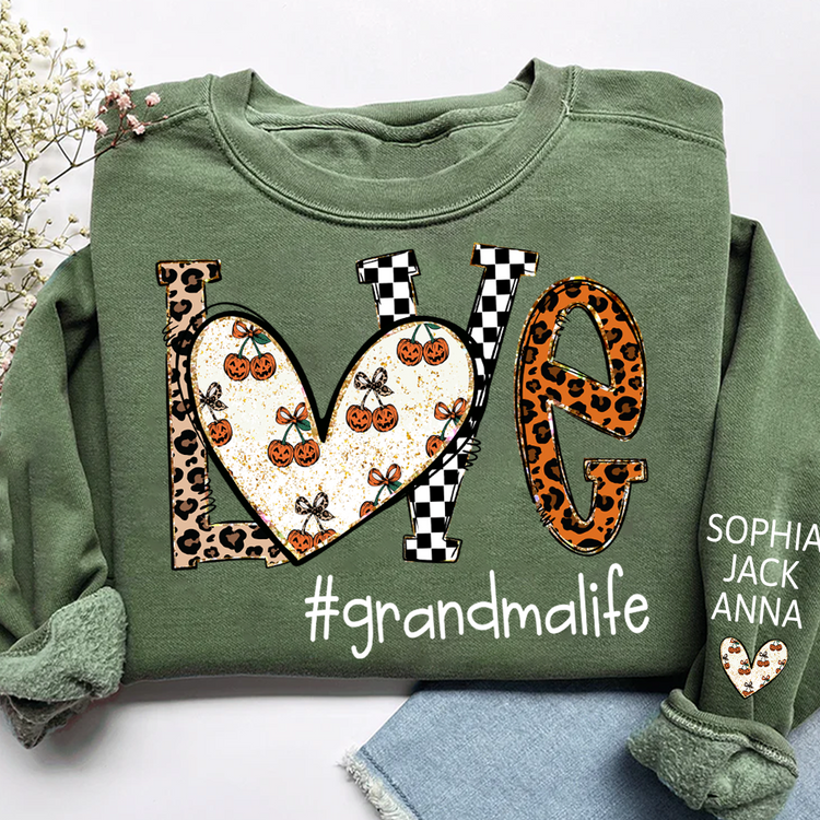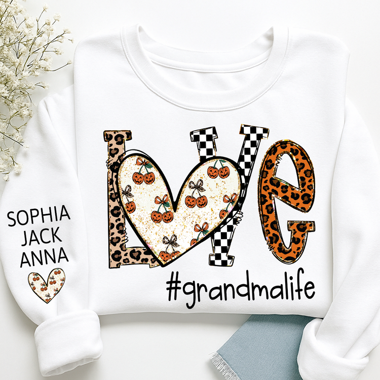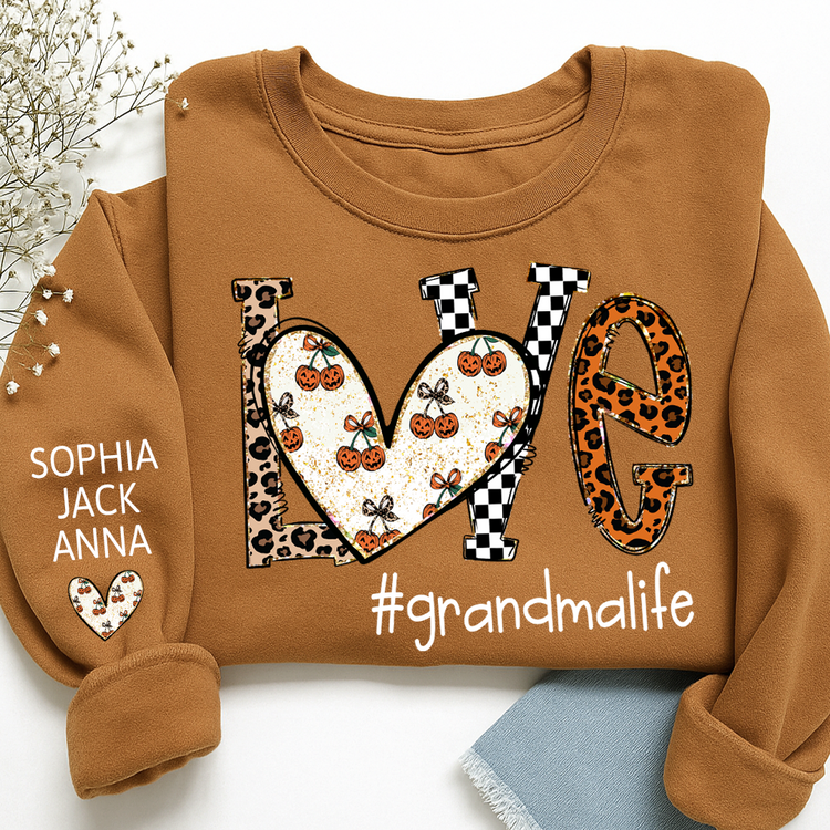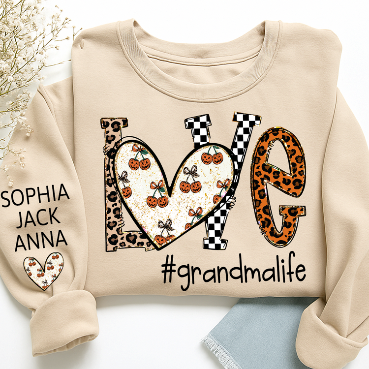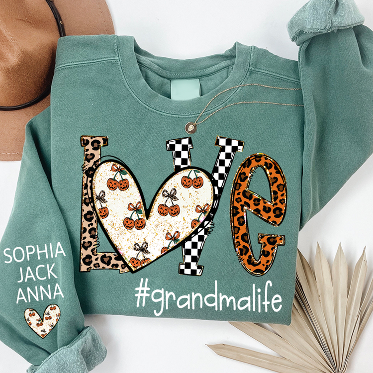 Love grandmalife Pumpkin Leopard Gift For Grandma And Grandkids Names on Sleeve Sweatshirt