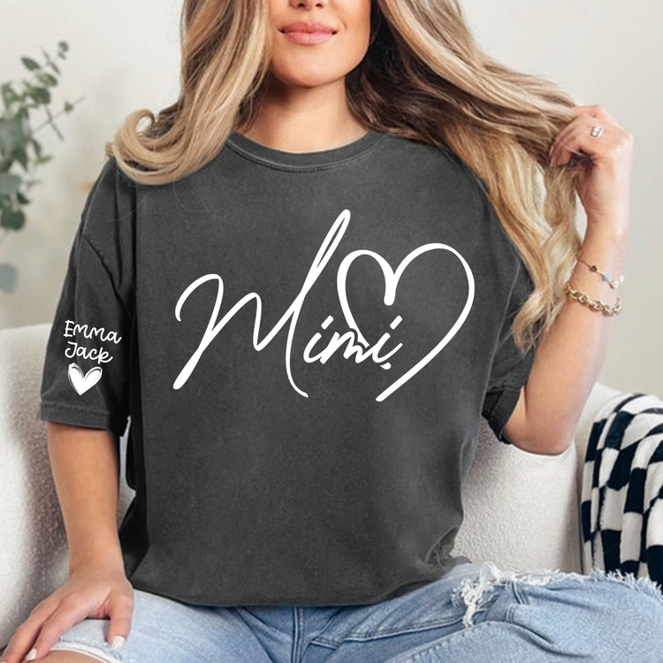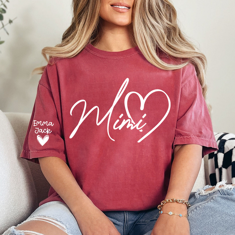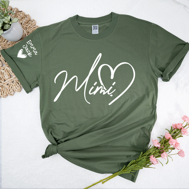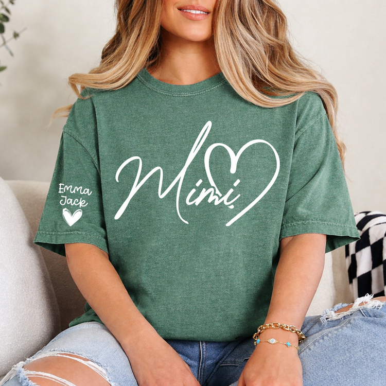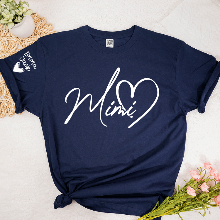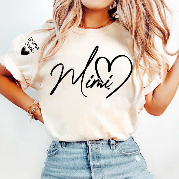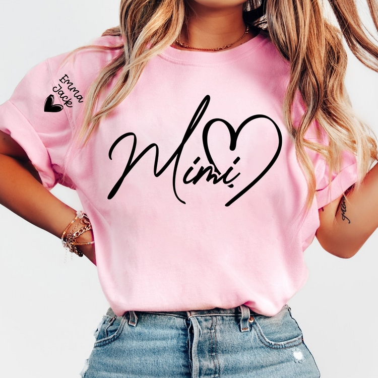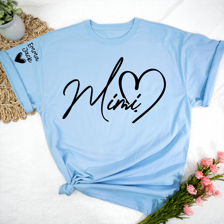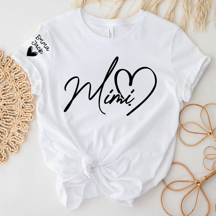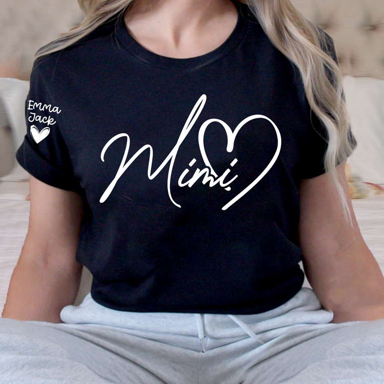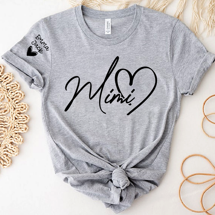 Personalized Family Mimi T Shirt with Custom Names, Simple Script Heart Design