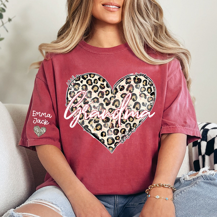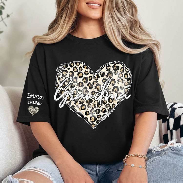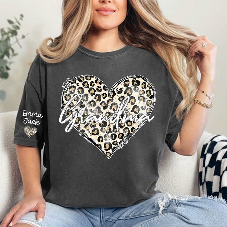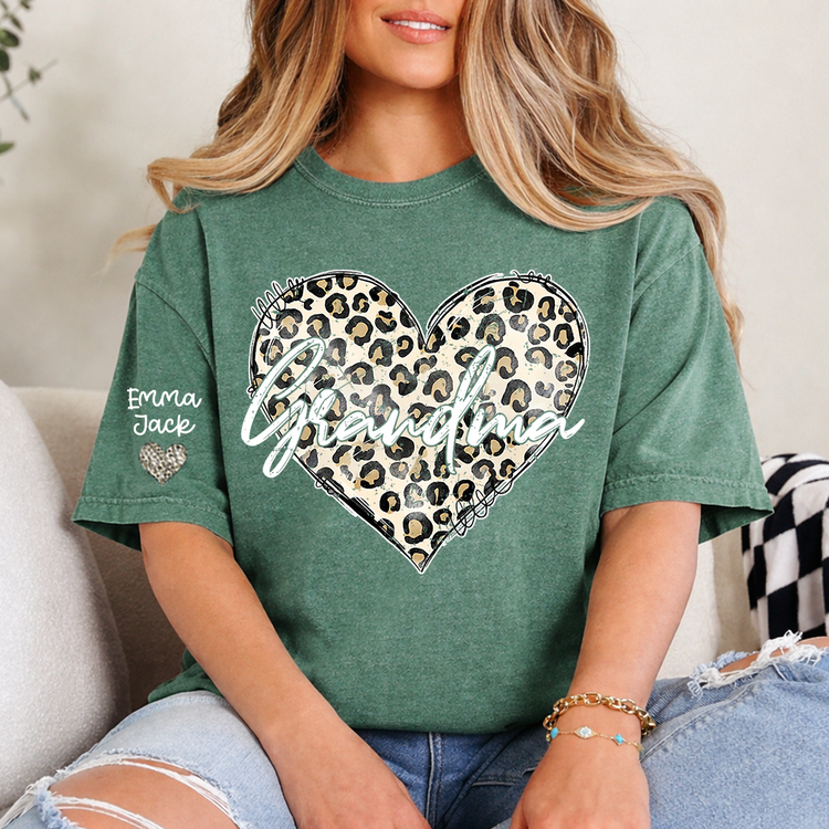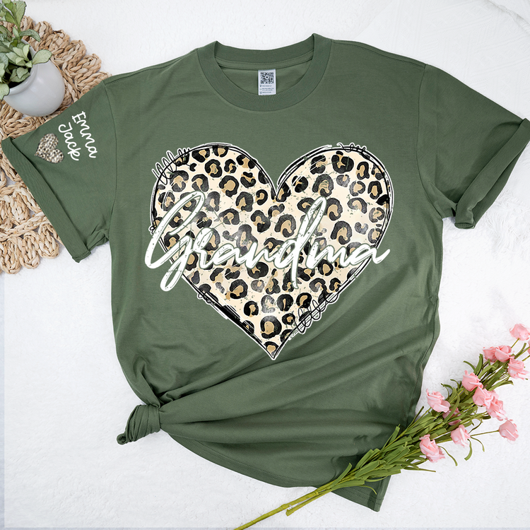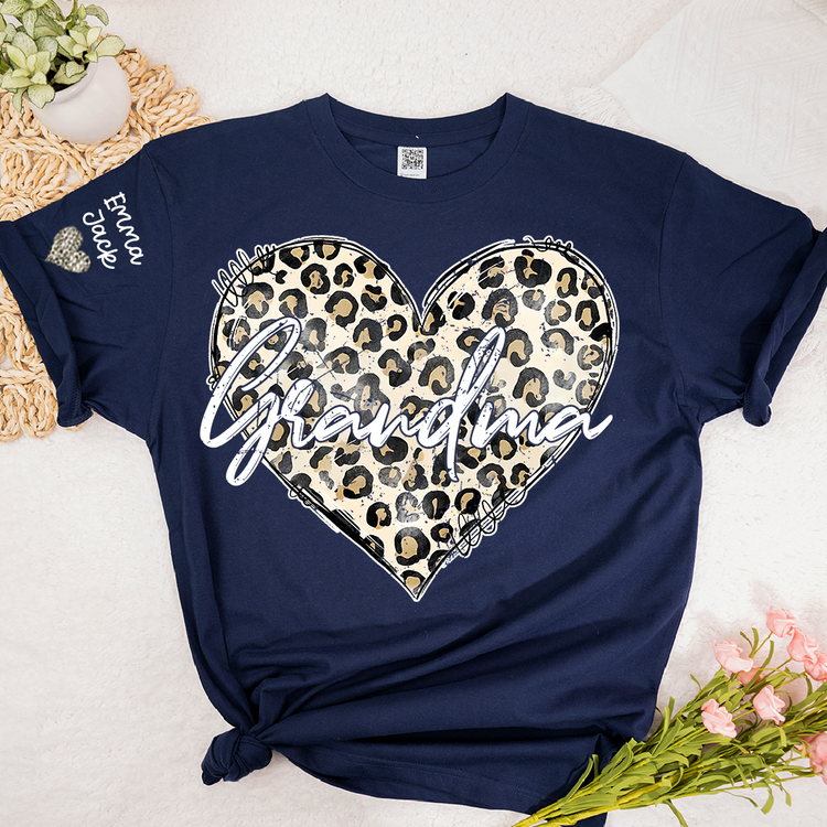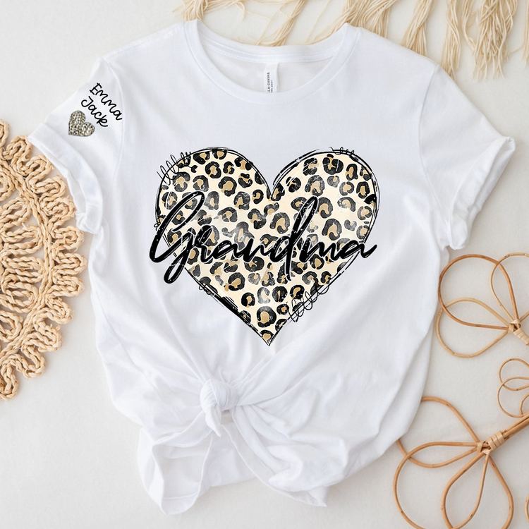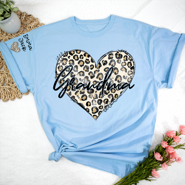 Personalized Grandma Shirt with Leopard Heart Design, Custom Family T Shirt