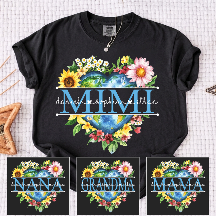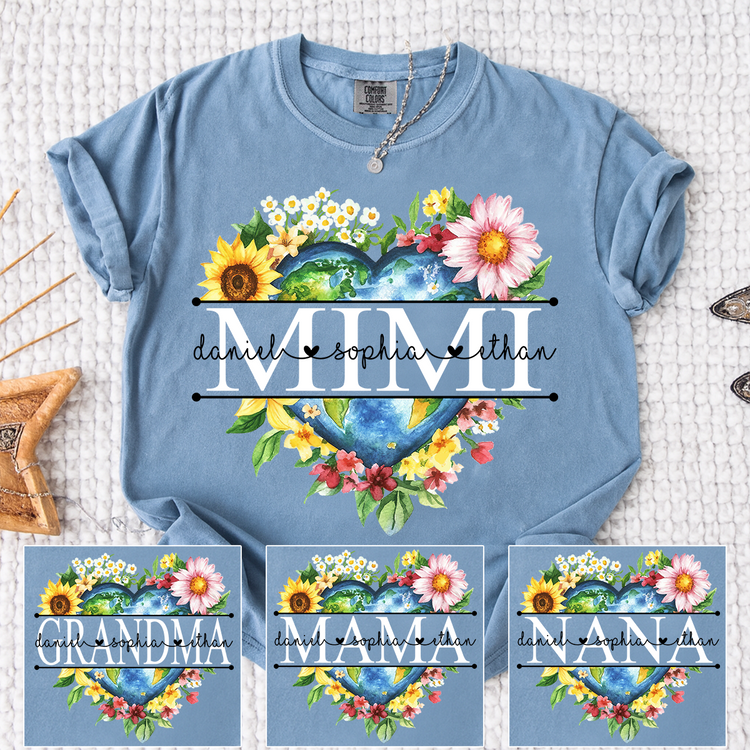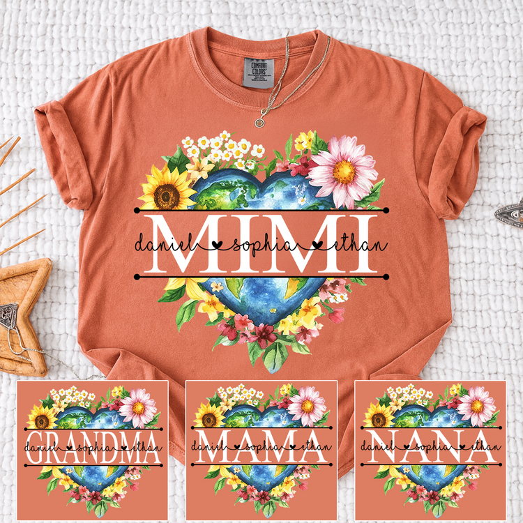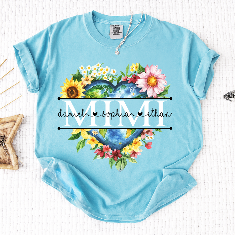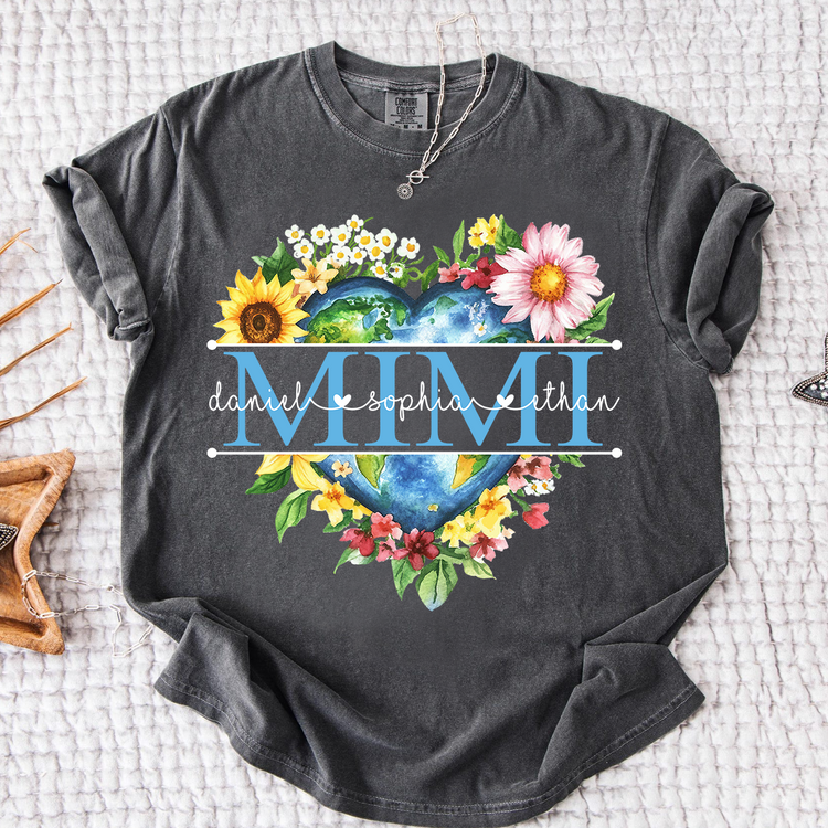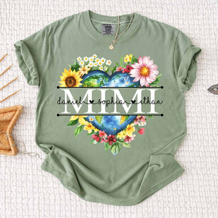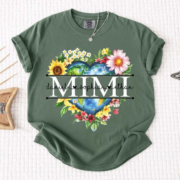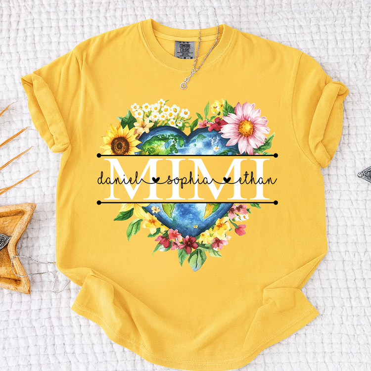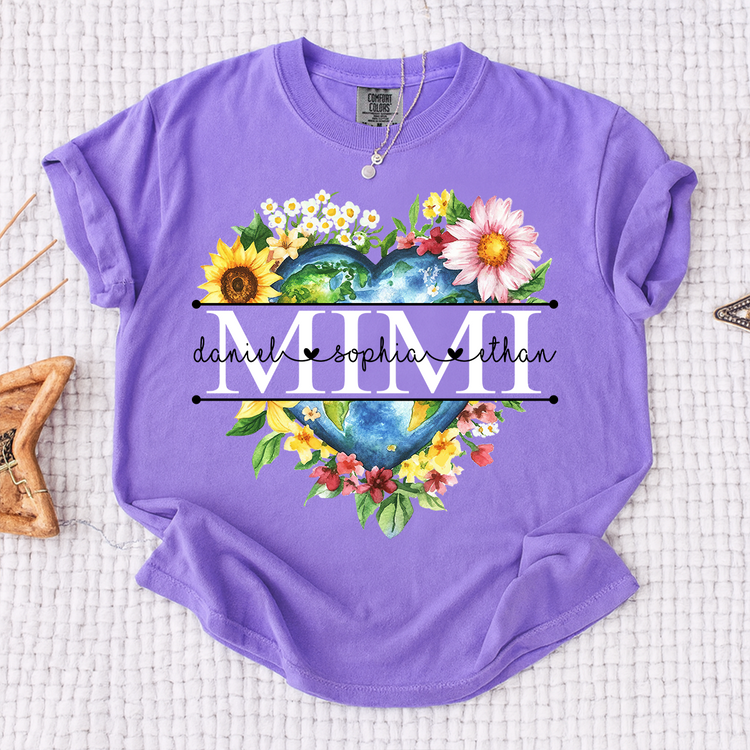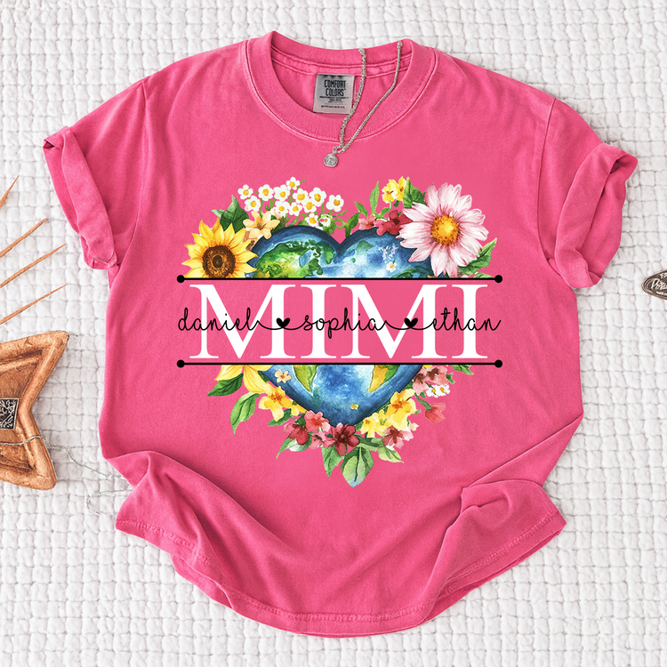 Comfort Colors Custom Mimi Heart Shaped Earth Shirt, Floral Heart Graphic with Grandkids Names, Family Love Tee