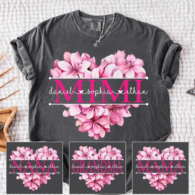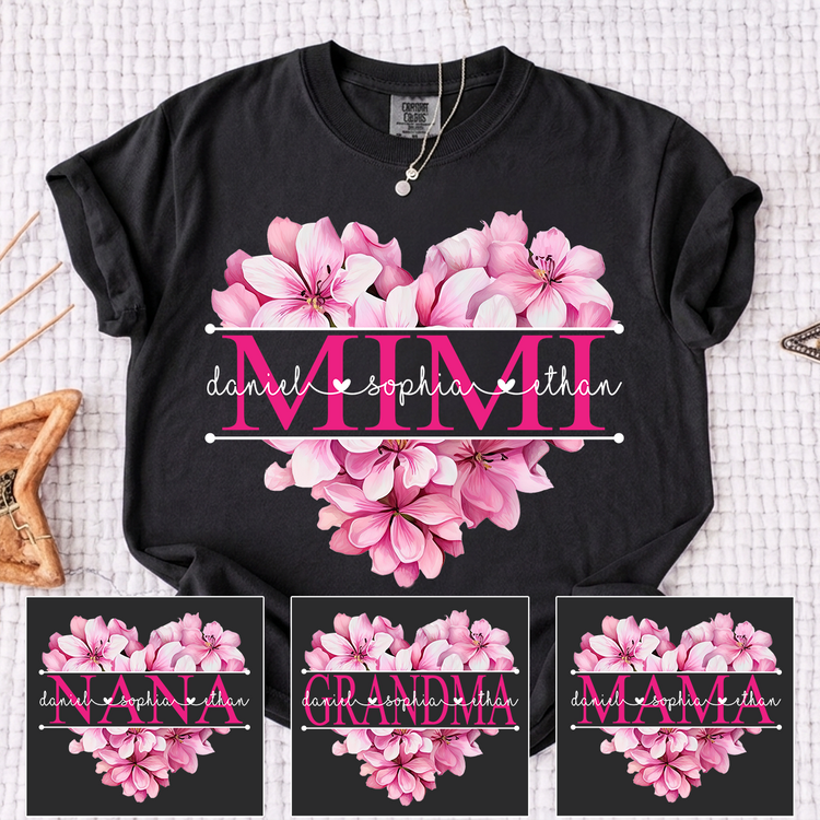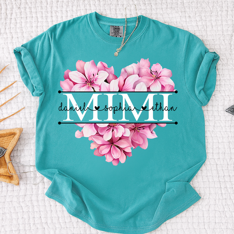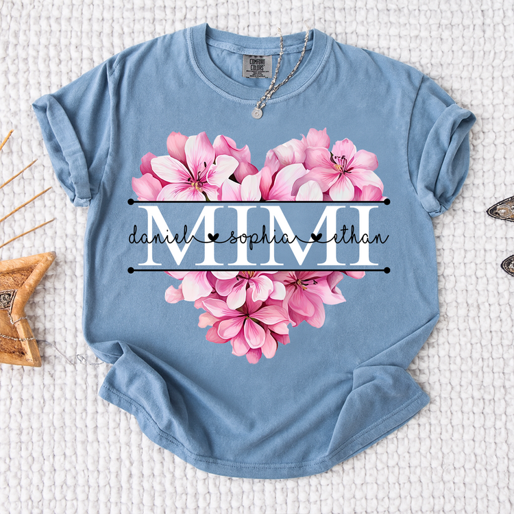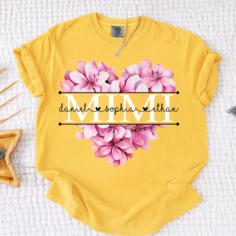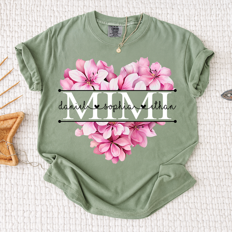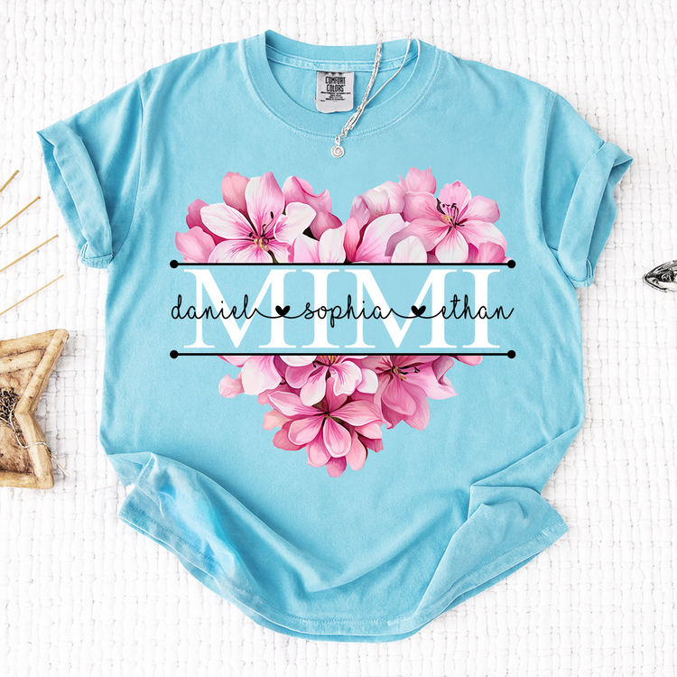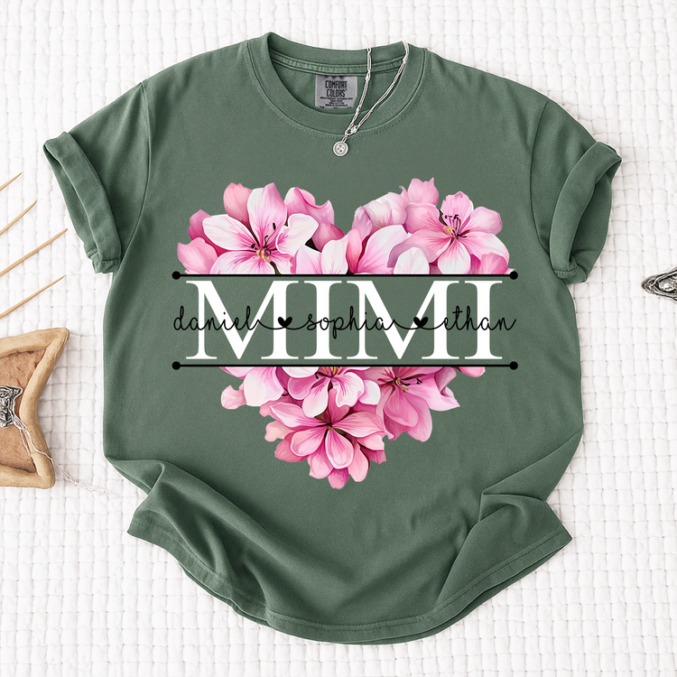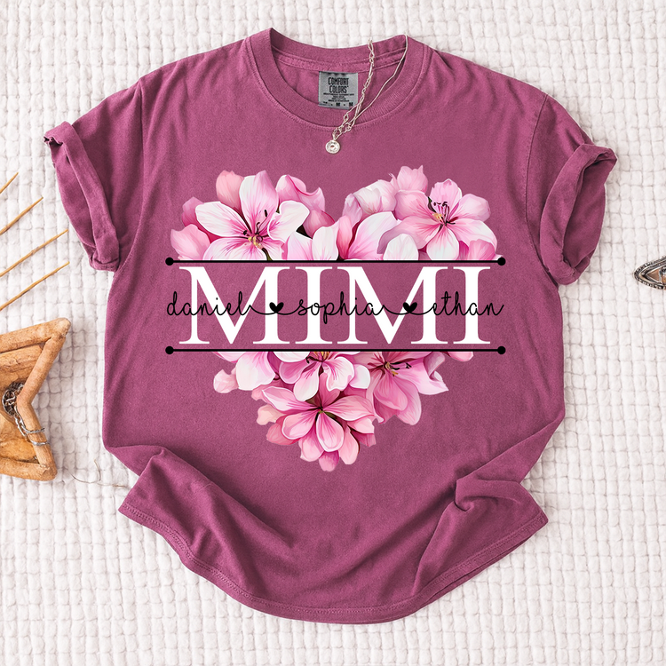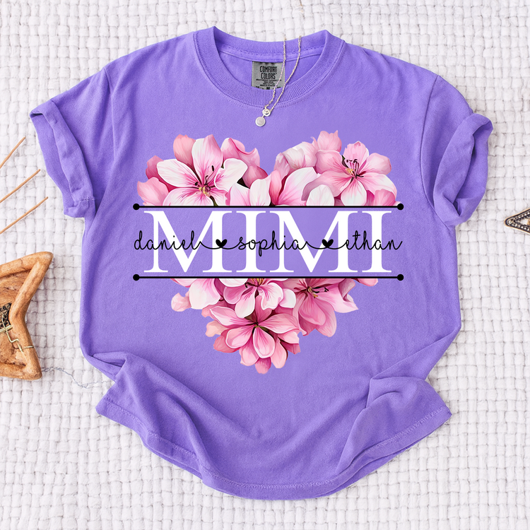 Comfort Colors Pink Floral Heart Design Family Tee, Personalized Mimi Shirt with Custom Names