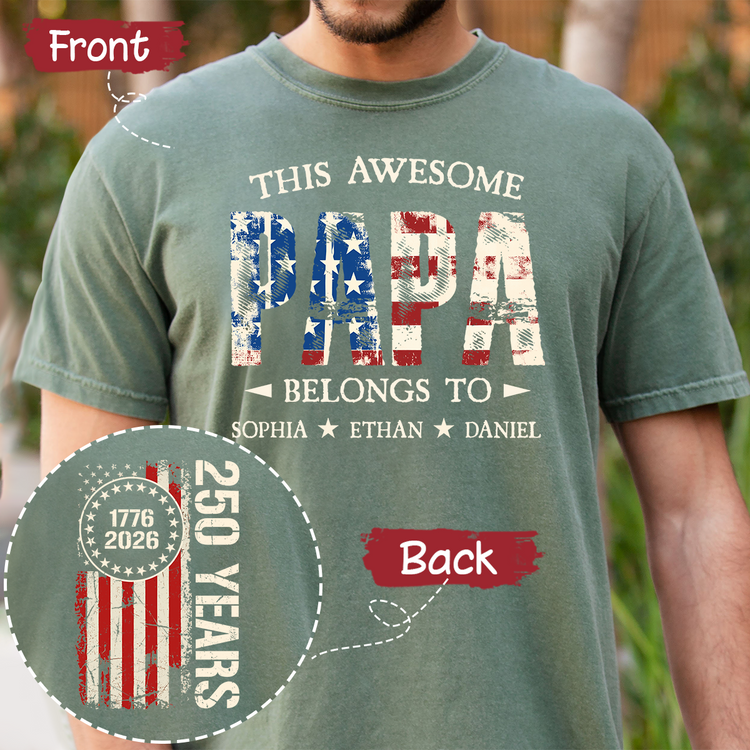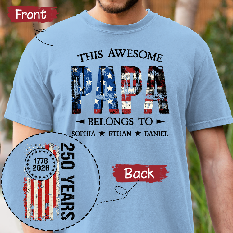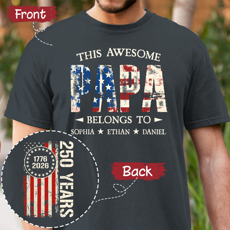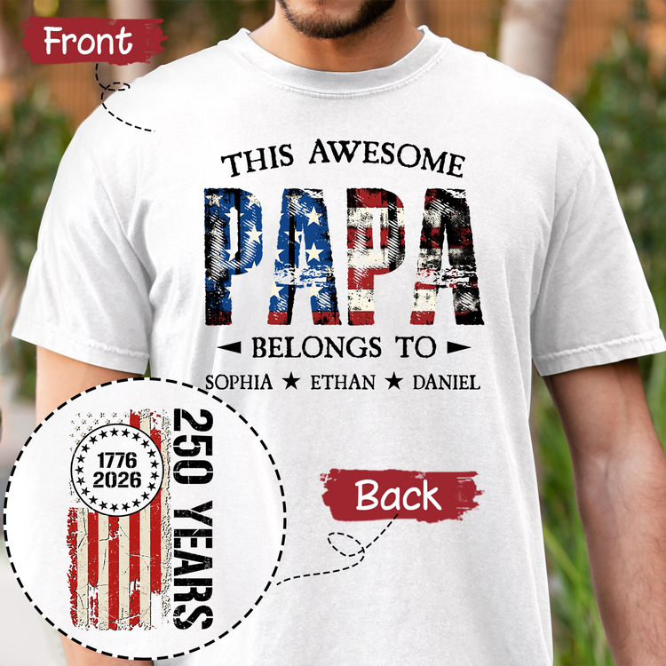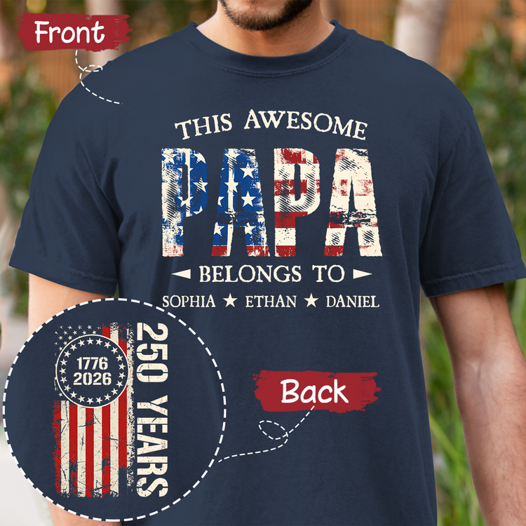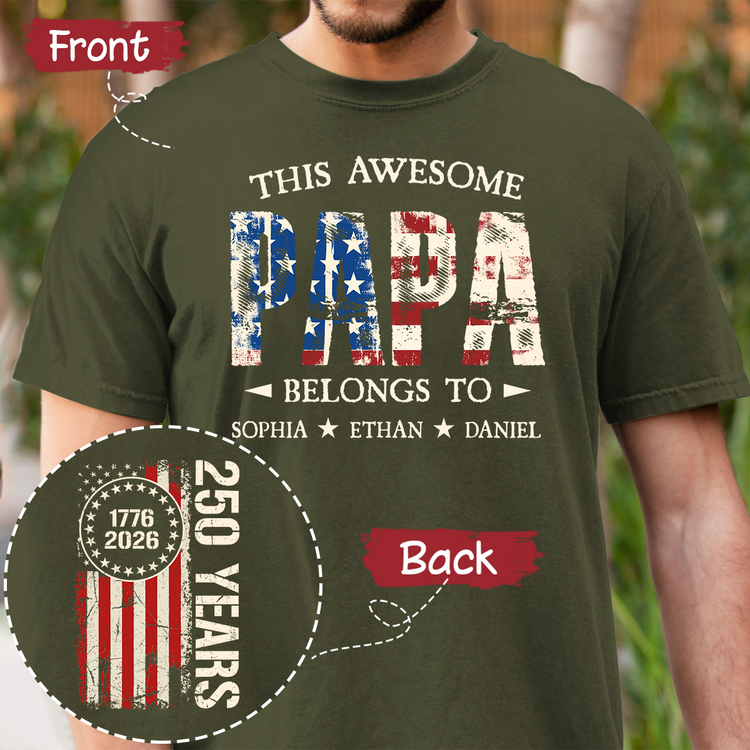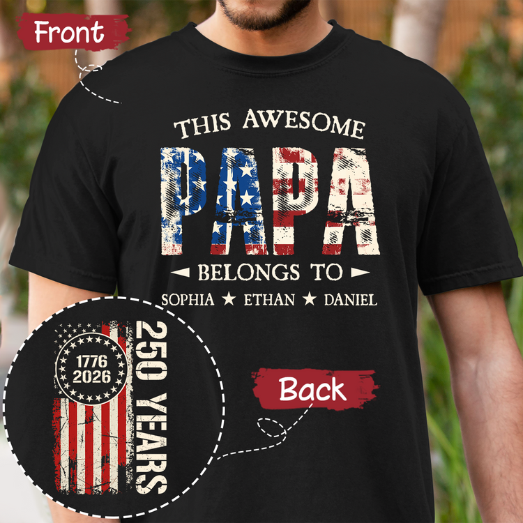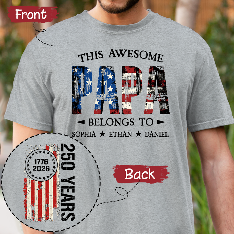 Custom This Awesome Papa Belongs To Shirt, Personalized with Grandkids Names, 250 Years American Flag Design